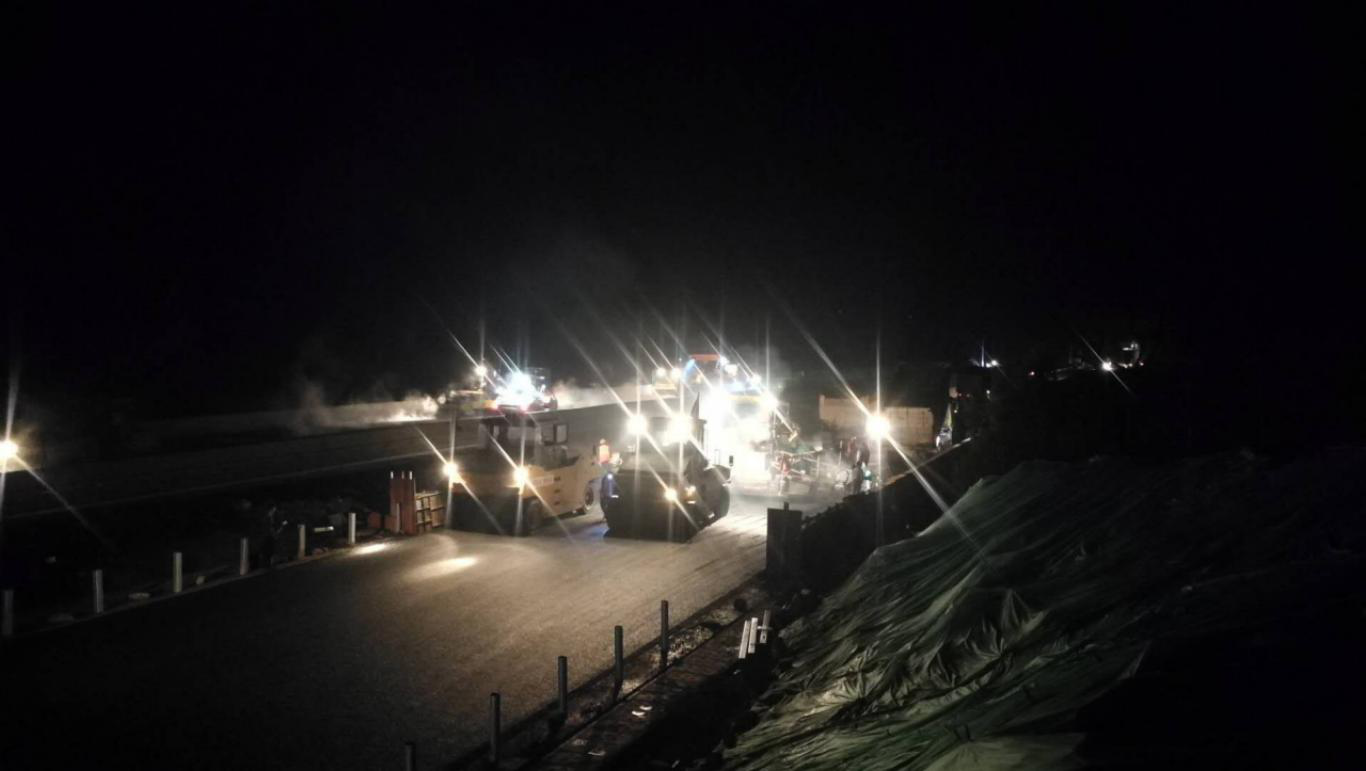 懷芷路面項(xiàng)目桐樹(shù)溪大橋左右幅于12月15日晚間同時(shí)開(kāi)始施工作業(yè),左右幅你追我趕,現(xiàn)場(chǎng)一派熱鬧的景象;懷芷項(xiàng)目一號(hào)拌合站的第一車(chē)上面層瀝