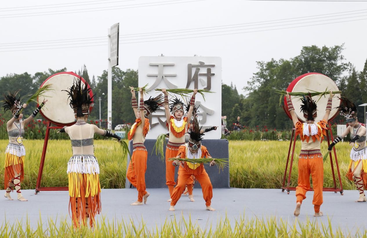 活動現(xiàn)場,隨著一曲精彩的《鼓上舞》上場,身著白色漢服的小演員們高呼“開鐮了!”歡快的童聲撒向了舞臺周圍金燦燦的稻田地,現(xiàn)場10太收割機同時啟動,拉開了活動序幕。崇州市政府副市長文國洪、市委辦公室主任廖慶發(fā)表了致辭。隨后崇州市政府相關(guān)領(lǐng)導及集團副總裁楊開榮上臺開鐮,割下新一季的水稻,放入印有“豐”字的竹筐中,寓意“五谷豐登”。