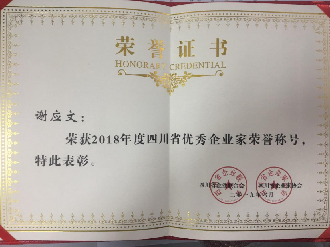謝應文董事長因其突出的業(yè)績與貢獻,先后榮獲“全國企業(yè)文化建設突出貢獻人物”,“西南國防動員建設十佳個人”,“四川省抗震救災先進個人”等榮譽稱號,2018年當選成都市第十三屆人民代表大會代表。