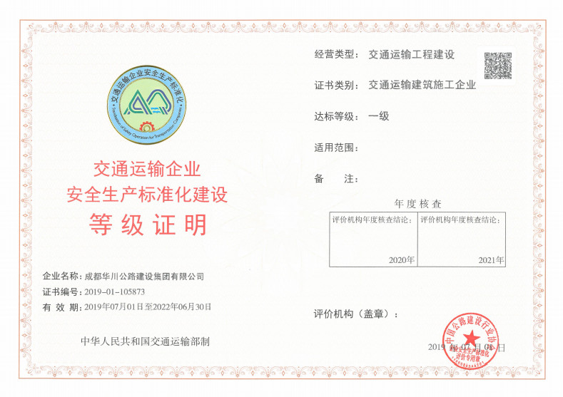 按照集團公司統(tǒng)一部署,于2018年10月啟動達(dá)標(biāo)創(chuàng)建工作。通過公司自查、備考、評價、驗收階段,穩(wěn)步推進(jìn)標(biāo)準(zhǔn)化達(dá)標(biāo)的各項工作開展。2019年4月9日-11日,交通運輸部達(dá)標(biāo)評審專家組對集團公司進(jìn)行一級達(dá)標(biāo)驗收,對集團安全生產(chǎn)標(biāo)準(zhǔn)化工作給予充分肯定。最終,集團公司順利通過交通運輸建筑施工企業(yè)安全生產(chǎn)標(biāo)準(zhǔn)化達(dá)標(biāo)認(rèn)證考核。