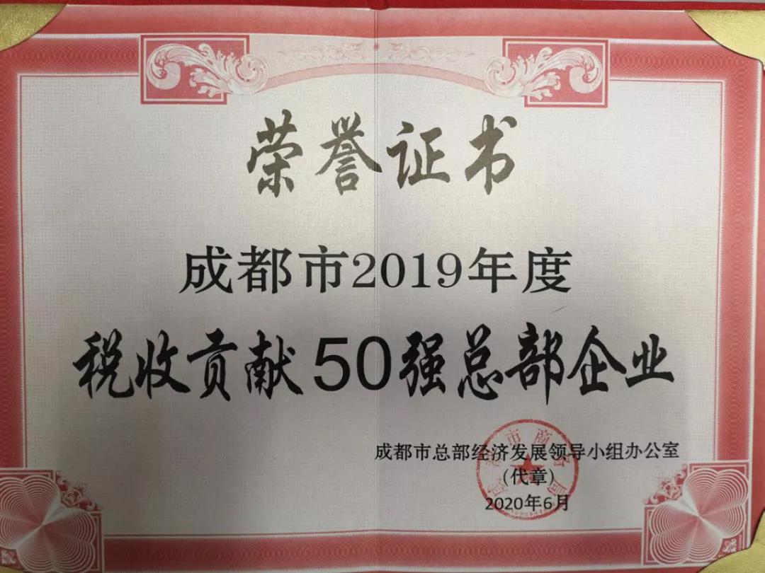近期,經(jīng)成都市總部經(jīng)濟發(fā)展領(lǐng)導(dǎo)小組評選,集團公司榮獲“成都市2019年度稅收貢獻50強總部企業(yè)”稱號。