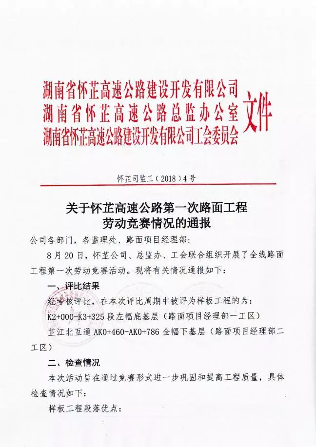 8月20日,懷芷公司、總監(jiān)辦、工會聯(lián)合在懷芷路面工程全線開展了勞動競賽。在本次競賽中,懷芷路面項目高度重視、積極參與。通過嚴格的原材料控制,科學的施工安排,高質量的施工組織懷芷路面K2+000-K3+325段左幅底基層、芷江北互通AK0+460-AK0+786全幅下基層被評為樣板工程。同時獲得施工拌和、運輸、攤鋪、壓實、養(yǎng)生等工序組織管理好、芯樣完整性好、級配良好、結構密實、厚度合格等好評,受到懷芷公司現(xiàn)金獎勵。